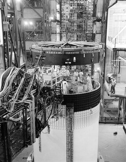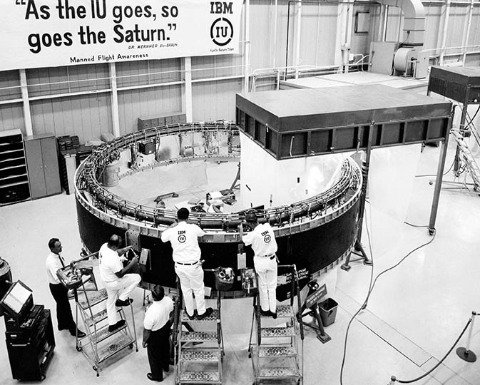 July 1969 also saw the first moon landing by the crew of Apollo 11. Nasa upgraded its ground-based IBM mainframes in 1968, the year before Apollo 11, to an IBM System/360 Model 50, which cost USD45K per month to rent. IBM also built the Instrumentation Ring or Instrument Unit (IU) to a NASA design. This was placed on the top of the third stage of the Saturn V and contained all the guidance, control and sequencing hardware for the main launch vehicle. This was largely developed in Federal Systems Division and built in Huntsville, Alabama. The IU was the nerve centre for the launch vehicle, determining when to fire the rocket motors, when to jetisson them and where to point them. Equipment included devices to sense altitude, acceleration, velocity and position, and the computer that laid out the desired course and give instructions to the engines to steer Saturn V on that course.