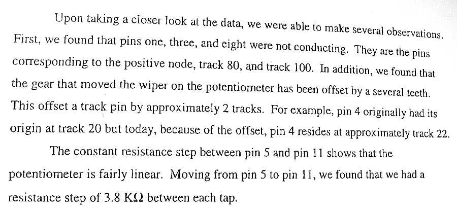 2. "We found that the gear that moved the wiper on the potentiometer has been offset by several teeth. This offset a track pin be approximately 2 tracks. For example, pin 4 originally had its origin at track 20 but today, because of the offset, pin 4 resided at approximately track 22.